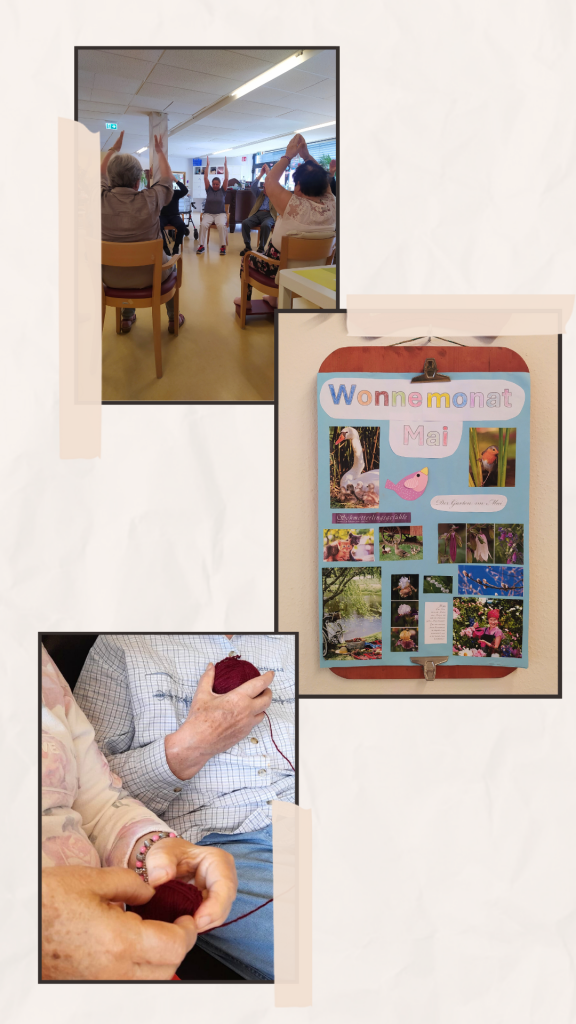 Die Sitzgymnastik wurde teilweise von fröhlicher Musik begleitet und umfasste Übungen mit unterschiedlich großen Bällen, die sowohl die Koordination als auch die Reflexe förderten. Bei warmem Wetter nutzten wir die Zeit, um mit dem Schwungtuch zu spielen, was angenehm Luft zu fächerte und für eine erfrischende Atmosphäre sorgte. Ergänzend wurden Übungen mit kleinen Handfächern durchgeführt, die die Feinmotorik zusätzlich forderten. Am Regentag wurde das Sportprogramm in zwei Gruppen aufgeteilt: Eine Gruppe absolvierte Übungen im Stehen als Sturzprophylaxe. Die andere Gruppe war im Sitzen aktiv.