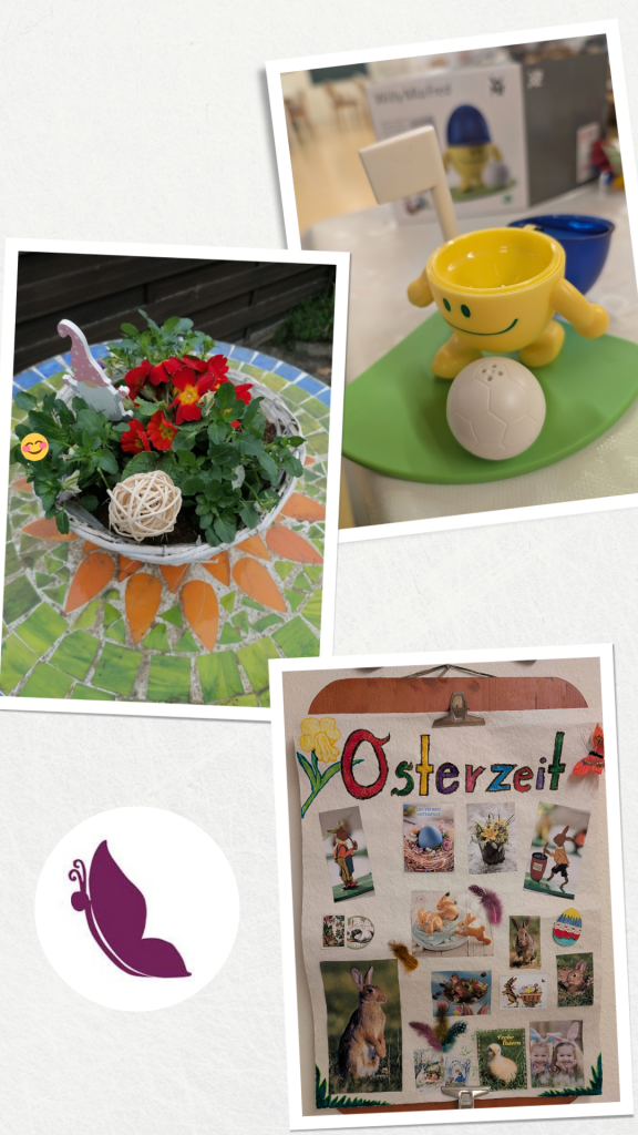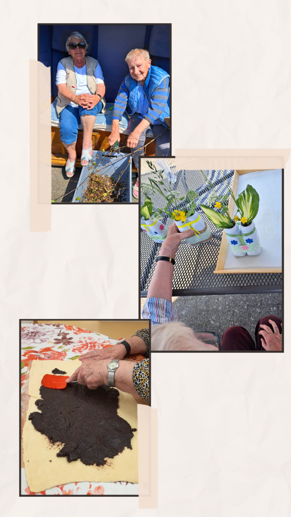 Am Mittwoch bepflanzte eine kleine Gruppe draußen bunte Töpfe mit frischen Blumen und fegte den Vorgarten, was die Gemeinschaft und das Verantwortungsbewusstsein förderte. In der Küche wurden zweimal köstliche Kuchen gebacken, und die Wäsche wurde sorgfältig gefaltet und aufgehängt.