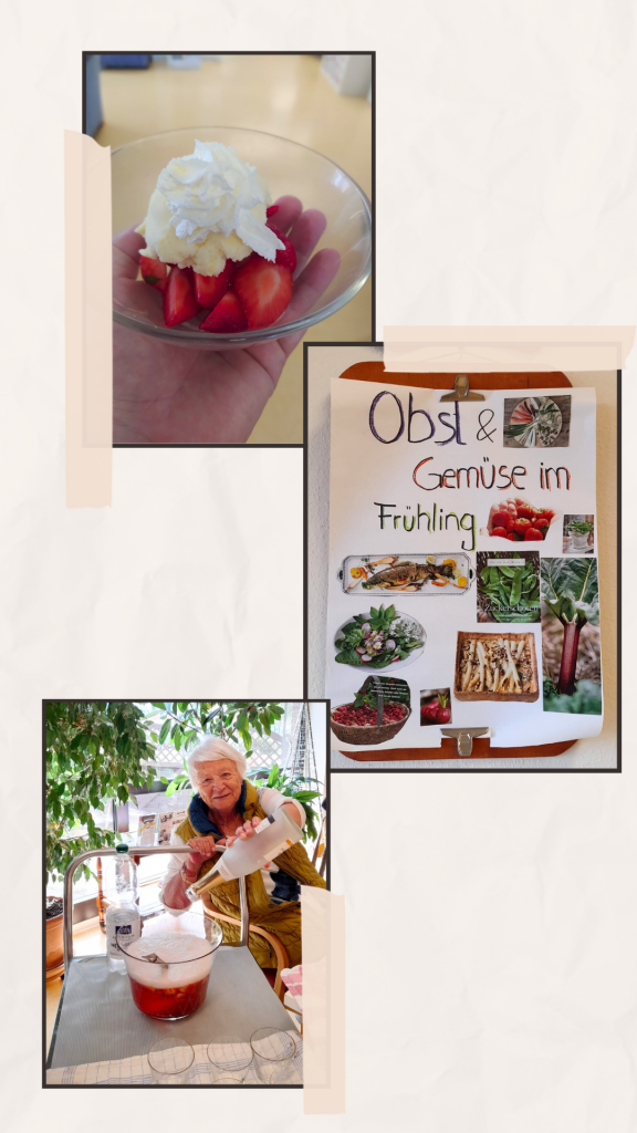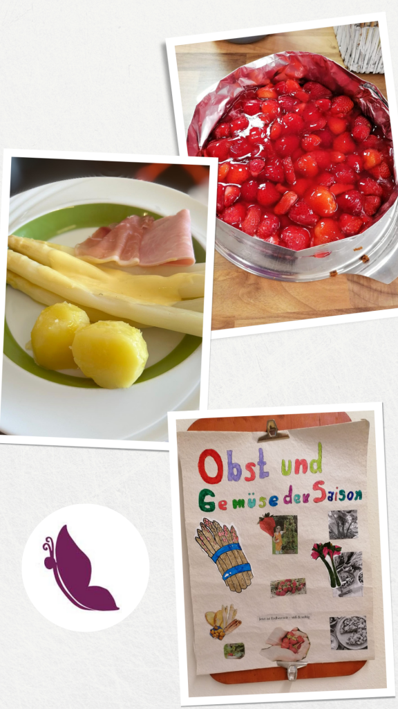 In der letzten Woche, die durch den Feiertag noch einmal etwas kürzer wurde, stand das Thema „Obst und Gemüse der Saison“ im Mittelpunkt unserer Aktivitäten. Im hauswirtschaftlichen Bereich haben wir fleißig gearbeitet: Es wurden Kartoffeln geschält, was immer eine schöne gemeinsame Aufgabe ist. Außerdem haben wir leckeren Apfel- und Rhabarberkuchen gebacken, was bei allen gut angekommen ist. Frische Erdbeeren wurden gewaschen und geschält, sodass wir sie später in verschiedenen Aktivitäten verwenden konnten.