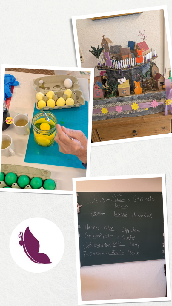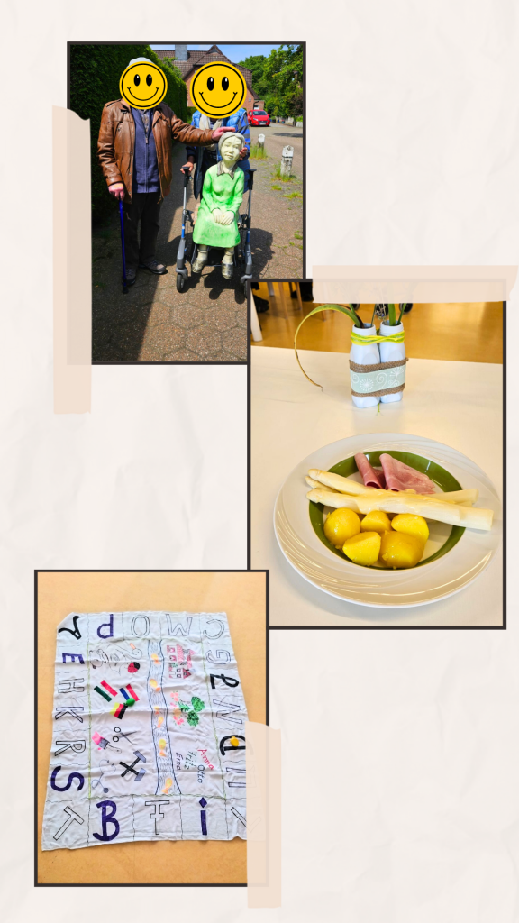 In der vergangenen Woche stand täglich das Lesen der Zeitung auf dem Programm, um das Allgemeinwissen zu erweitern. Es gab ein spannendes kognitives Angebot, bei dem eine allgemeine Quizrunde für Unterhaltung sorgte. Außerdem wurden Aktivitäten wie Wörter mit „Spargel“ suchen und finden angeboten, und es entstand eine Wortsammlung zum Thema „Obst und Gemüse der Saison“. Aus dem Wort „Spargelsuppe“ wurden kreative neue Wörter entdeckt. Zudem wurde ein neues Themenplakat gestaltet, Bilder ausgemalt, Erdbeeren aus Tonpapier gefertigt und nach dem Malen nach Zahlen gearbeitet.