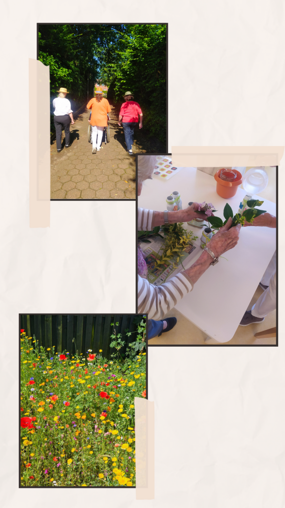 Unsere Sitzgymnastik wurde durch fröhliche Musik begleitet, und wir haben mit Bällen und Handfächern Übungen gemacht, die sowohl Spaß gemacht als auch die Beweglichkeit gefördert haben. Bei schönem Wetter nutzten wir die Gelegenheit für Spaziergänge im Freien, um die frische Luft zu genießen.