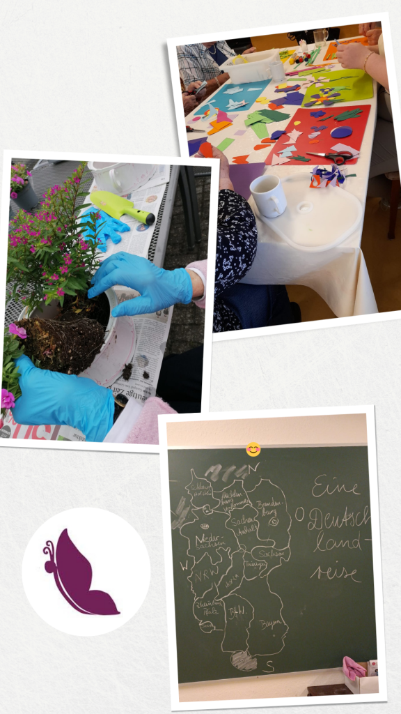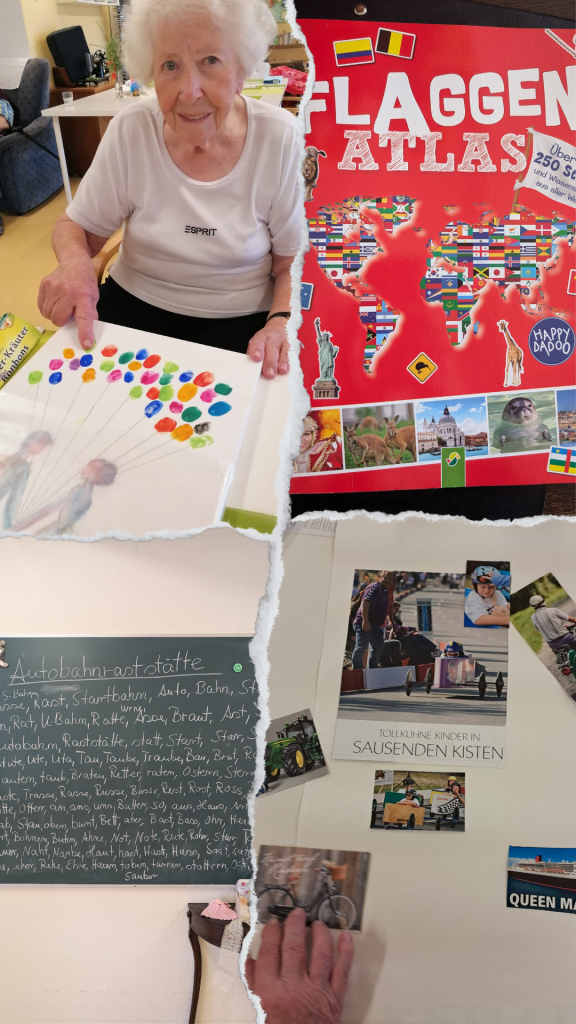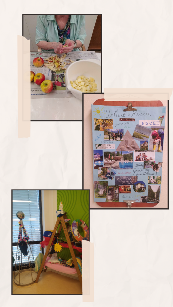Kognitiv haben wir uns mit verschiedenen Angeboten beschäftigt: Wir haben Reimgeschichten gehört, Worträtsel zum Thema Urlaub gelöst, Sommerbingo gespielt und Länder sowie Städte in Europa aufgezählt. Außerdem haben wir Sprichwörter, die mit Reisen oder Urlaub zu tun haben, aufsagen und Lieder, in denen Städte oder Länder vorkommen, gesungen.