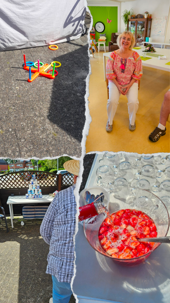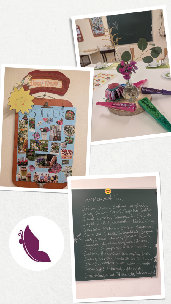 Kognitiv wurden verschiedene Aktivitäten angeboten: Ein Reaktionsspiel mit Ball und Becher im Freien, eine Quizrunde zum Thema Sommer sowie Wortsammlungen zu Nord- und Ostsee und zum Thema Urlaub. Zudem wurde eine Mitmachgeschichte „Wie heißt das Lied richtig?“ durchgeführt, um das Gedächtnis und die sprachliche Ausdrucksfähigkeit zu fördern.
