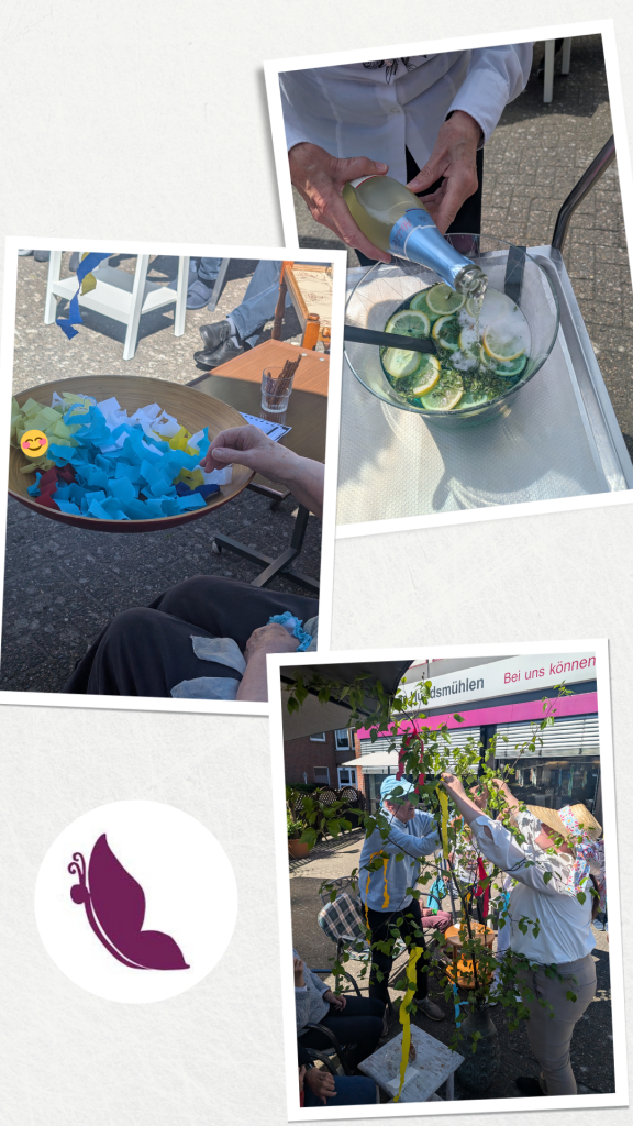 Kreativ waren wir ebenfalls aktiv: Wir haben Erdbeeren aus Papier hergestellt, was viel Spaß gemacht hat und die Kreativität gefördert hat. Am Freitag haben wir den Maibaum abgekracht, wobei die Äste zerkleinert wurden – eine schöne Tradition, die den Frühling einläutet. Dazu gab es leckere Erdbeerbowle.