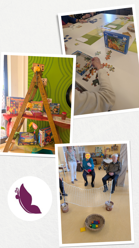 In kleineren Gruppen ging es dann etwas aktiver zu. Die Senioren wurden unter Anleitung in Spielen wie „Kugelwohl“, Dominos, Ringewerfen und Sandsäckewerfen gefordert. Dabei wurde nicht nur die Geschicklichkeit, sondern auch die Koordination trainiert. Besonders in der Bewegungsrunde wurde die Ausdauer gestärkt: Mit unterschiedlich großen Bällen übten wir die Hand-Augen-Koordination, und beim Kartoffel-auf-dem-Löffel-Wettbewerb wurde die Geschicklichkeit auf die Probe gestellt.