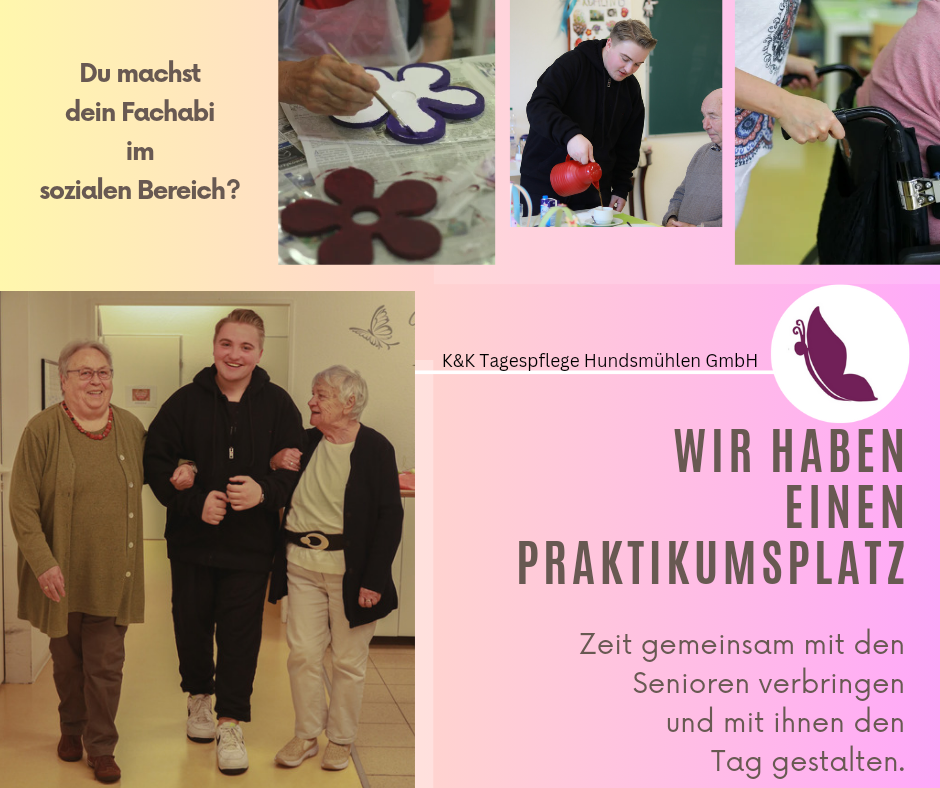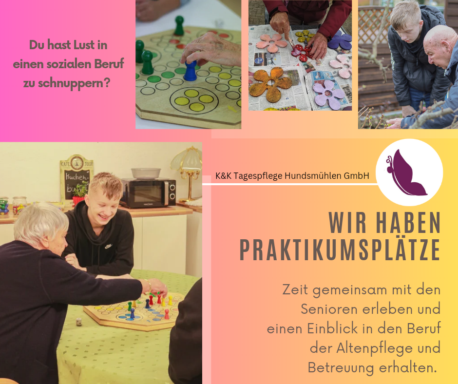 Wir geben dir die Gelegenheit dich in unserem Team auf Augenhöhe zu bewegen und bringen dir den Kontakt zu unseren Gästen näher. Gemeinsam lernst du den Umgang mit Senioren in geschützter Atmosphäre. Deine Tätigkeiten beinhalten Spaziergänge, Spiele spielen, Gespräche führen und leichte hauswirtschaftliche Tätigkeiten wie Tische eindecken und mit den Gästen Gemüse schnibbeln oder beim Kuchen backen unterstützen.